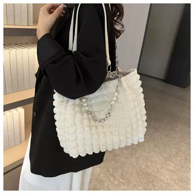 Velvet Charm Tote – Soft Textured Tote Bag with Pearl Chain Detailing